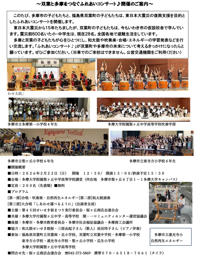 多摩と双葉の子どもたちが心をひとつにし、和太鼓や吹奏楽・合唱・エネルギーの学習発表などを行い交流します。「ふれあいコンサート♪」が双葉町や多摩市の未来について考えるきっかけになったらと願っています。ぜひご参加ください。